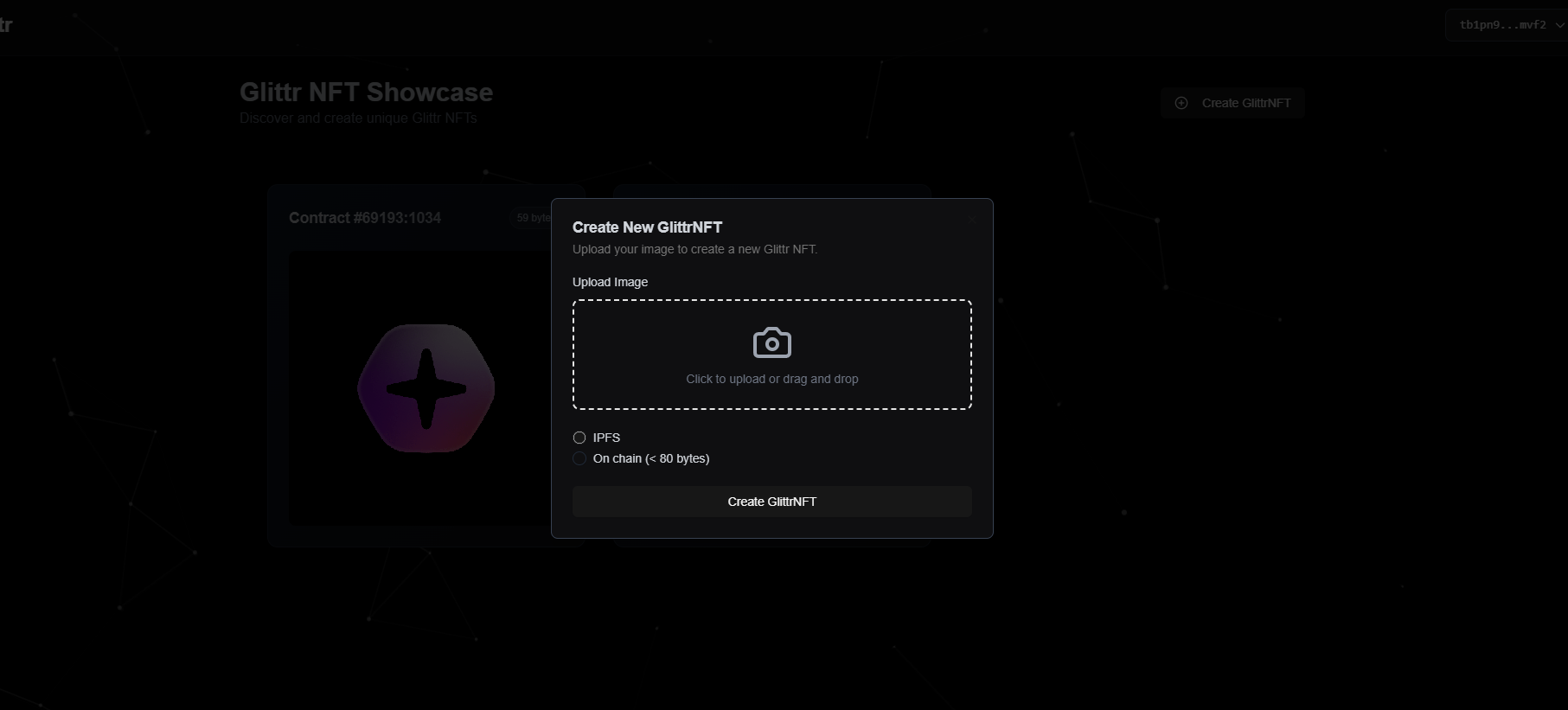 If you’d like to create your own NFT, you can click the "Create GlittrNFT" button. From there, you can upload your image and choose how to store it—either using IPFS or embedding it on-chain (images must be less than 80 bytes for on-chain storage).