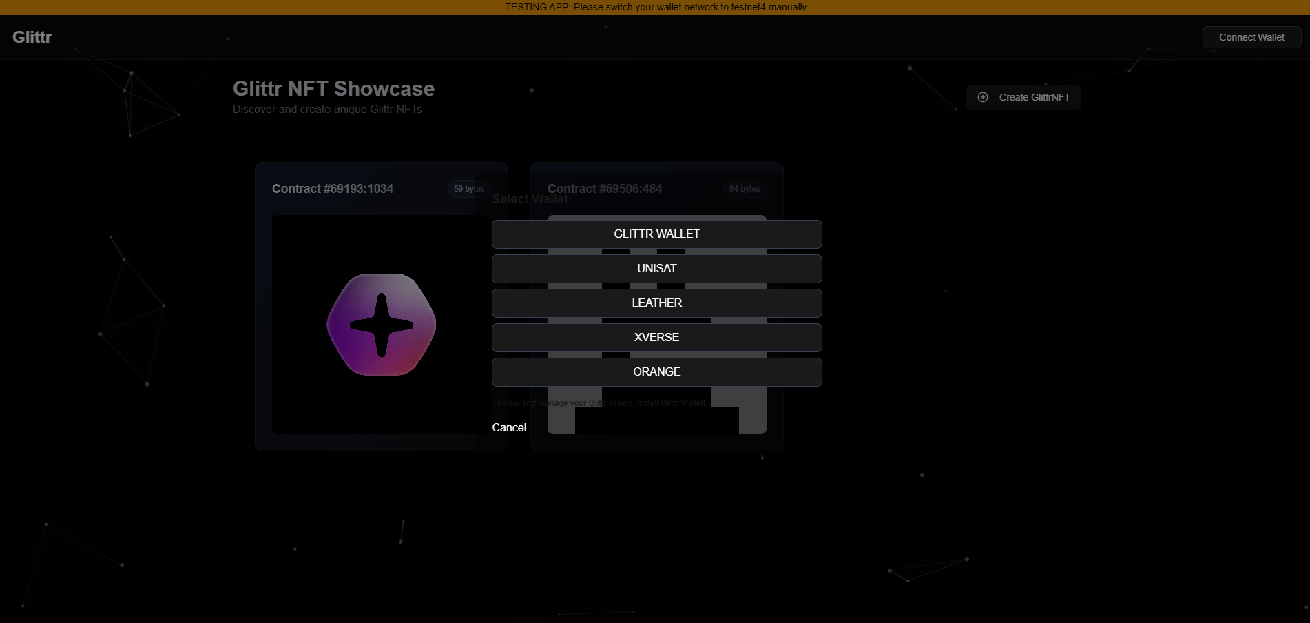 Visit our [website ](https://nft-example-app.glittr.fi/)to preview the NFT app and explore its features.